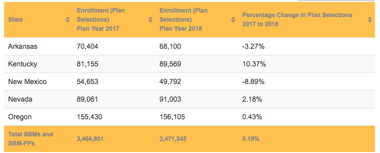 [2] These state-based marketplaces use the federal platform or website (SBM-FP) but control their outreach and manage the health plans offered through their marketplaces. The enrollment platform (including the website) is controlled by the FFM. Data reported is from Final Weekly Enrollment Snapshot For 2018 Open Enrollment Period, Dec. 28, 2017. https://www.cms.gov/Newsroom/MediaReleaseDatabase/Fact-sheets/2017-Fact-Sheet-items/2017-12-28.html?DLPage=1&DLEntries=10&DLSort=0&DLSortDir=descending